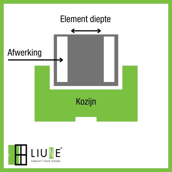 Het standaard formaat van het kozijn gaat uit van de dikte van het element plus 2x 13 mm voor de afwerking.