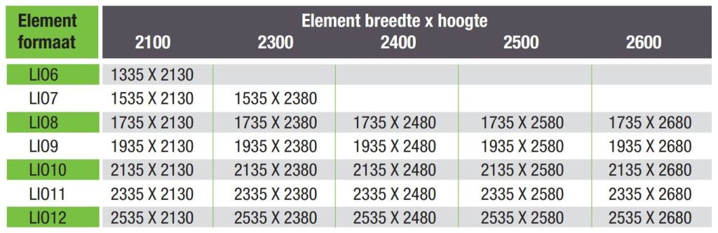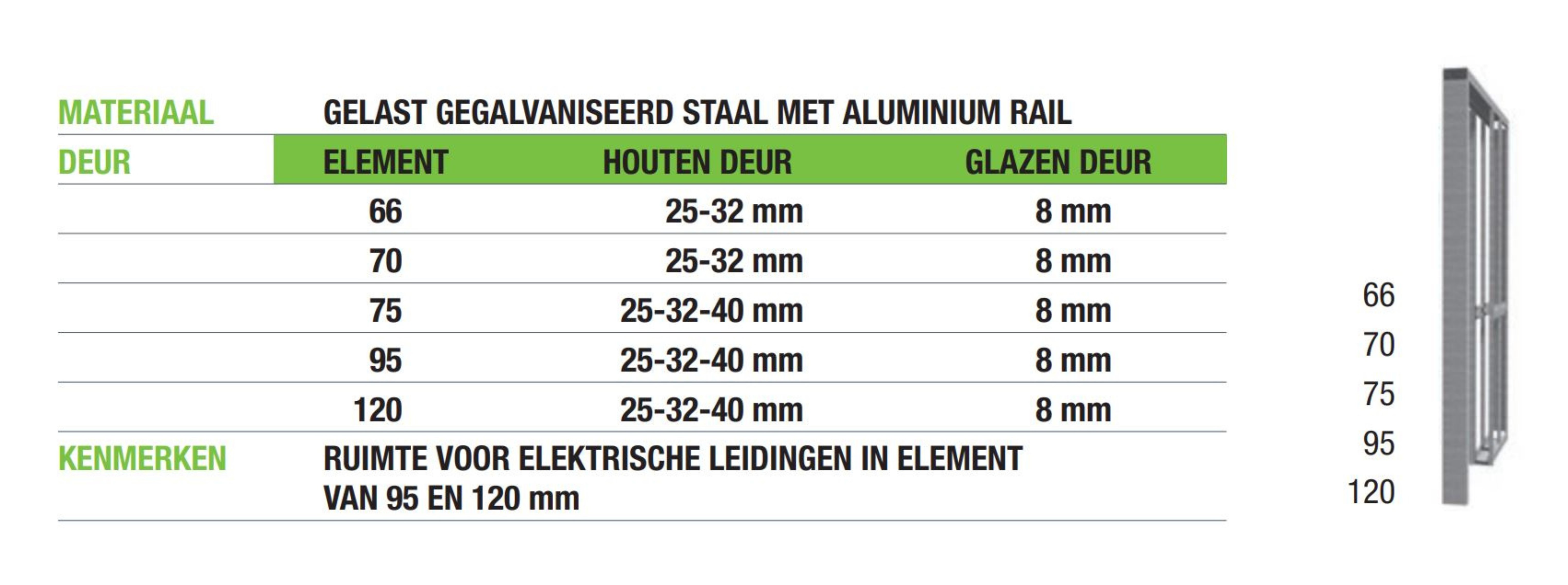 De elementen zijn beschikbaar in 5 verschillende diktes, 66, 70, 75, 95 en 120 mm.